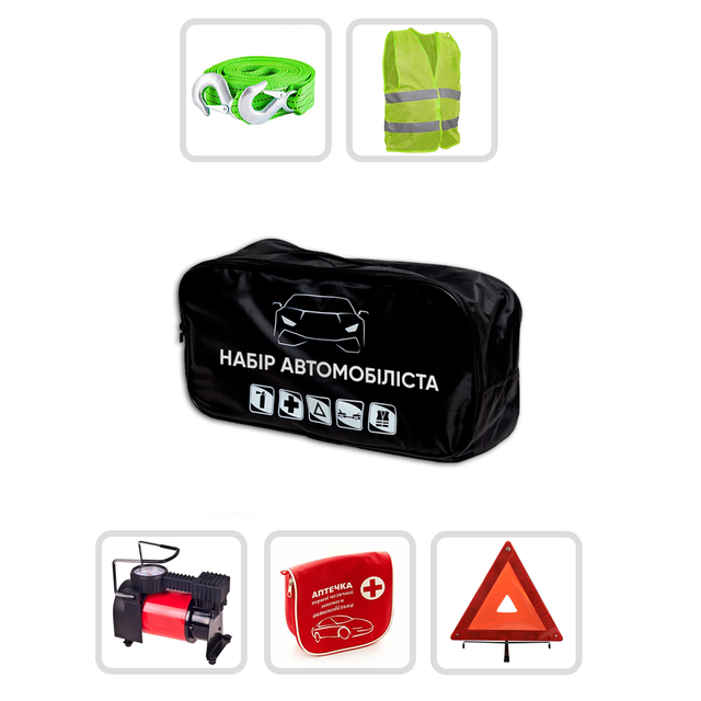 | Комплектація набору | Трос буксирний, Сумка, Світловідбиваючий жилет, Аптечка, Знак аварійної зупинки |